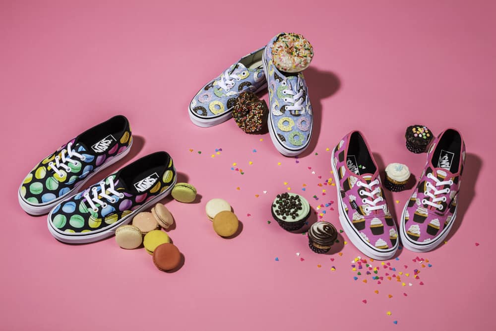 Is dit leuk! Vans met echte fastfood favorieten. Hamburgers, Franse frietjes en taco’s op de Vans Authentic, terwijl de Klassieke Slip-On pepperoni pizza punten laat zien. Alle vier de prints zijn zo realistisch dat je ze bijna kunt proeven! Ben je meer een zoetekauw? De Authentic is ook uitgedost met zoete lekkernijen, waaronder kleurige macarons, heerlijke donuts en schattige cupcakes.