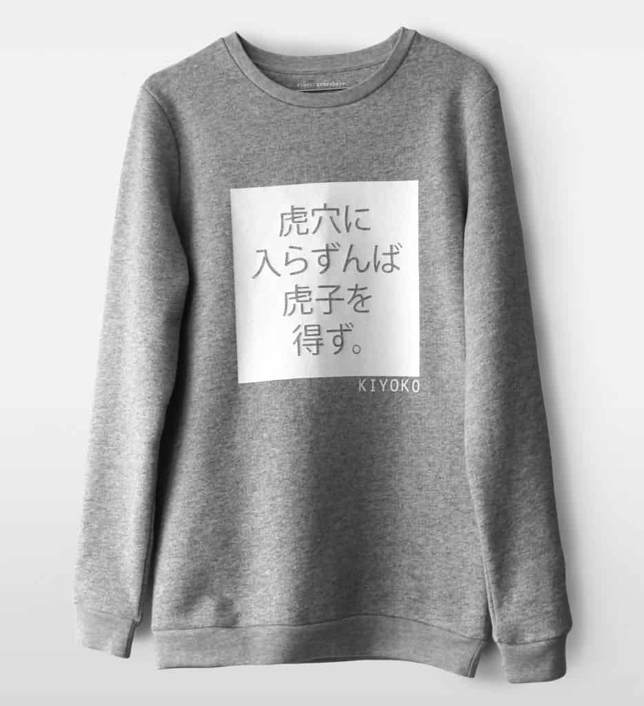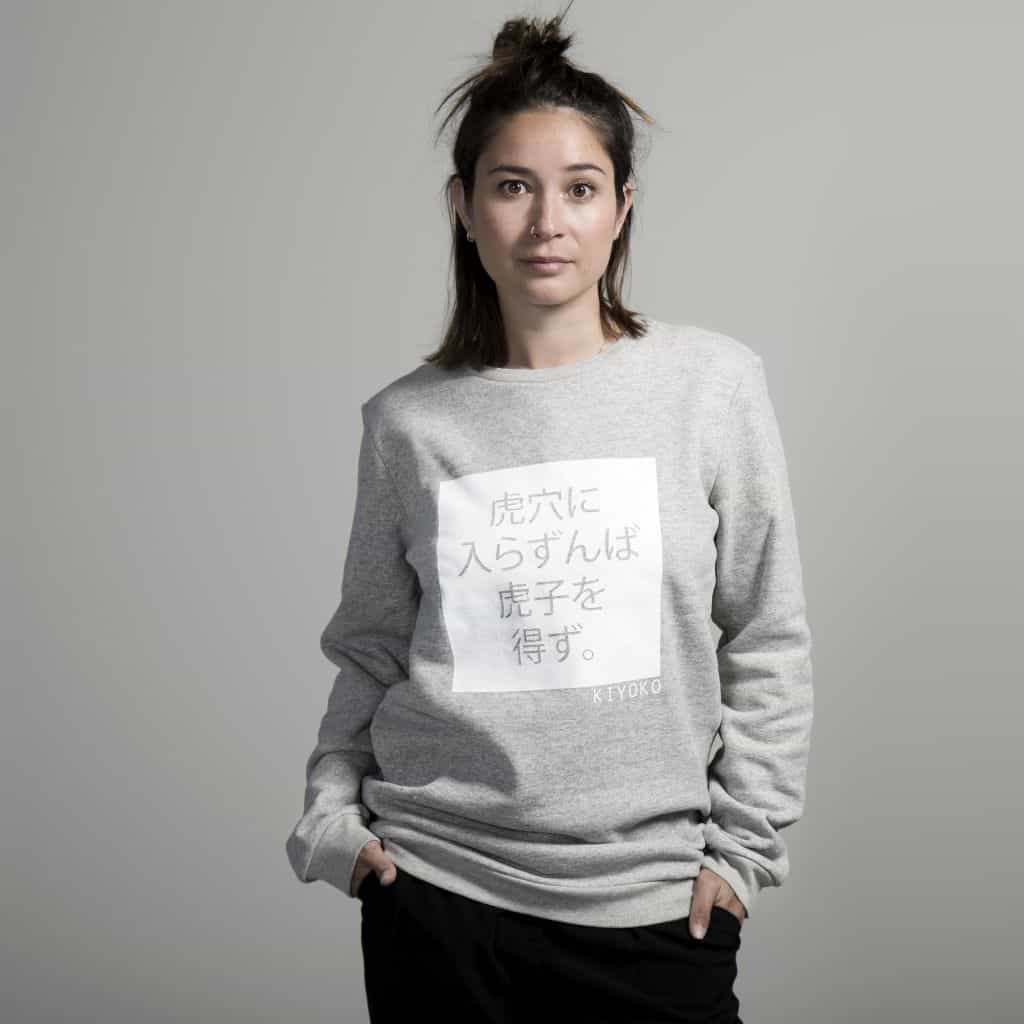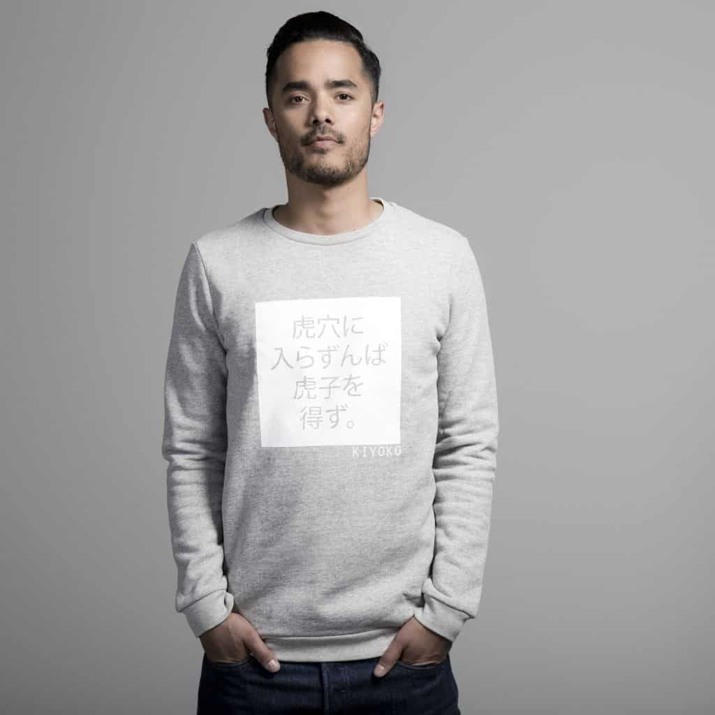 De sweater is gemaakt van 100 procent organic cotton en heeft een minimalistische print die verwijst naar het land waar de twee Nederlandse oprichters zich door laten inspireren: Japan. De print verwijst naar de liefde van de twee oprichters Evelien en Merel voor Japan en vertelt hun visie: ‘you cannot catch a tiger cub unless you enter the tiger’s den’. Oftewel no guts, no glory. Vanuit deze visie willen de oprichters hun klanten inspireren om altijd werk te maken van hun ideeën.