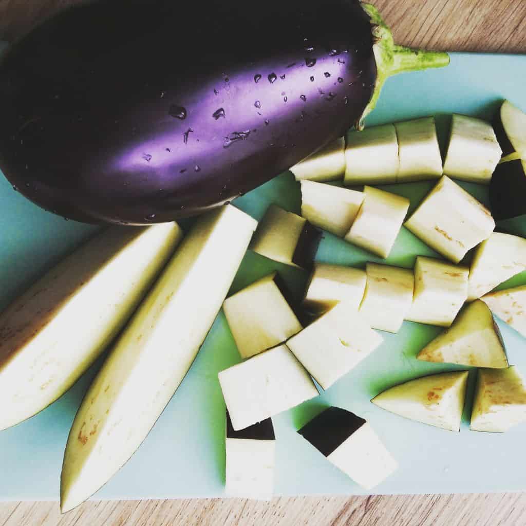 Rasp de schil van 1 citroen en halveer de vrucht. Snijd de andere citroenen in partjes (ik deel ze in vieren en serveer er 2 p.p.). Snipper de ui en snijd de aubergine in (niet te kleine) blokjes. Verhit olijfolie in een pan, fruit de ui en voeg de aubergine toe. Voeg het citroenrasp en de rozijnen toe. Knijp de twee citroenhelften boven de pan uit (let op eventuele pitjes). Voeg 50 ml (kraan)water toe en stoof de aubergine met de deksel op de pan in 6 min. gaar.
