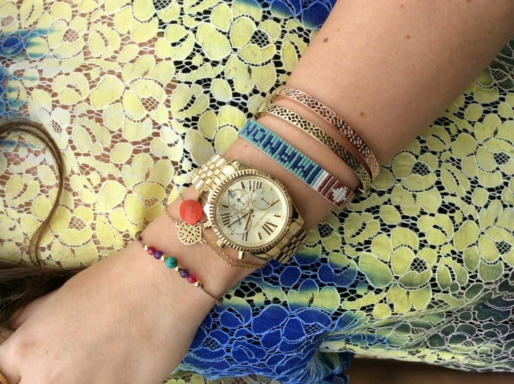 Ze houdt van gouden armbandjes afgewisseld met ‘touwtjes’ armbandjes, die ze heeft gekregen. Haar sieraden moeten een persoonlijke waarde hebben.