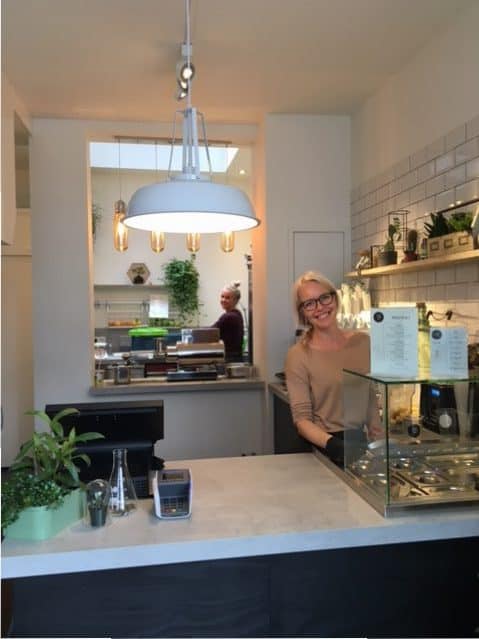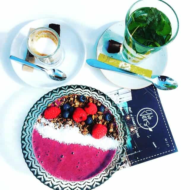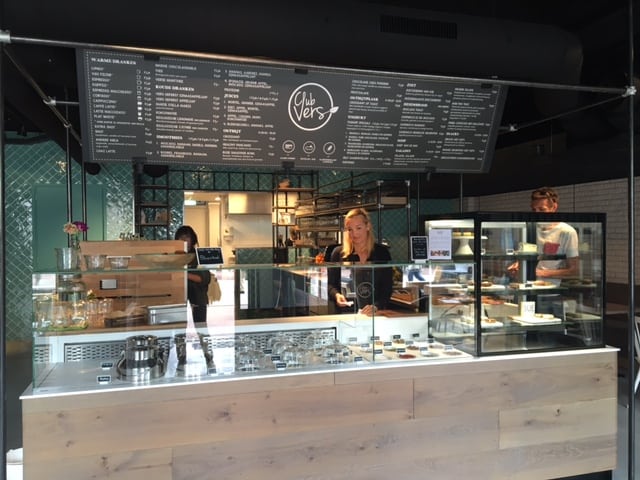 Club Vers ligt op het pleintje voor het Hollands Spoor. Dus heel handig voor reizigers die een gezond ontbijtje mee willen nemen of mensen zoals mijn vriendinnetje M en ik, die op het zonnige terras willen genieten van een heerlijke smoothiebowl, koffietje en verse muntthee. Bij minder weer zit je binnen te genieten van al het gezonde lekkers in een echte moderne ‘huiskamersfeer’. En wat we vooral fijn vonden is dat je aan de bar bestelt, maar dat de vriendelijke bediening je bestelling wel komt brengen. Door de uitgebreide kaart zoals smoothies, sapjes, lekkere koffies, theetjes, een yoghurt bar, healthy pancakes, chocolade chia pudding, taartjes van SUE, falafel salade, gegrild zuurdesembrood met huisgemaakte humus en avocado en nog veel meer, kom je zeker terug! En je kan heel fijn kiezen tussen animal protein of plant based foods. Oh ja, aan de bar kan je GRATIS water met fruit uit zo’n geweldige Mason Jar tap halen. Goed nieuws, in het najaar openen ze een 2e vestiging in de buurt van het Centraal Station.