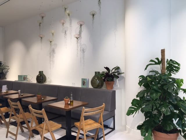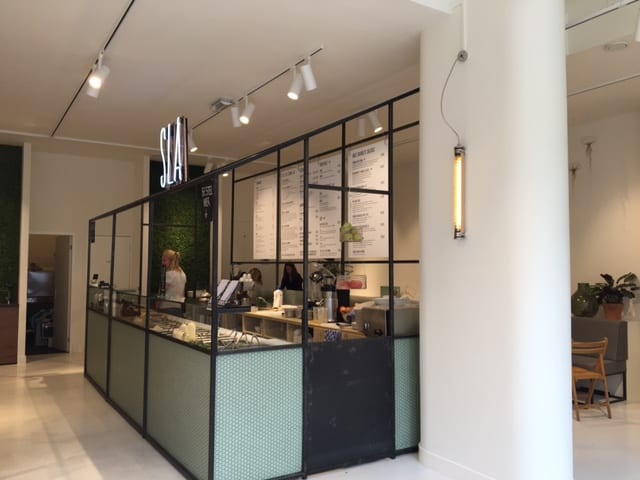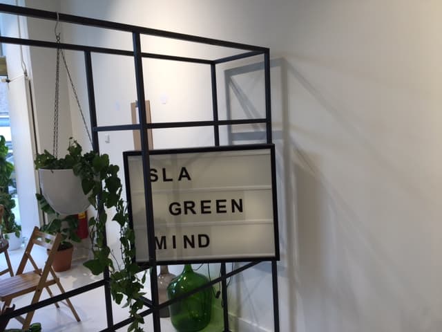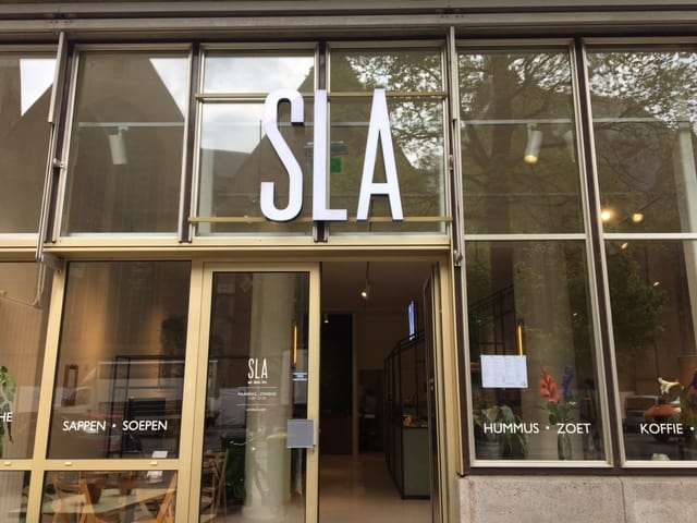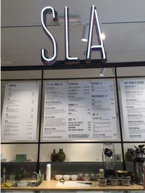 Ook wij hebben nu onze eigen vestiging van Sla met dezelfde strakke mintgroene inrichting, het mos aan de muur en je kan hier, aan het Kerkplein, zelf je thee “tappen” uit de Quooker bij de thee bar met een free refill. Sla Den Haag is ook groot en relaxed genoeg om hier met je laptop te crashen en te werken. Intussen genieten van o.a. de smoothie bowl, bananenbrood, heerlijke sapjes, smoothies, salades!, soepjes, hummus of een Vegan Rainbow Bowl; eat in or take out. En heb je geen tijd om langs te gaan bestel dan via Deliveroo (fietskoerier), zoals een samengesteld SLA-menu. Eat Green, Think Green!